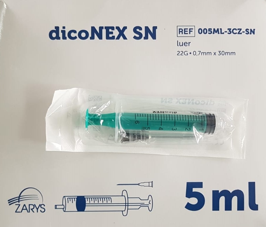 Luer vienreizlietojamā šļirce. Caurspīdīgs cilindrs ar melnu skalu. Komplektā ir pievienota adata.